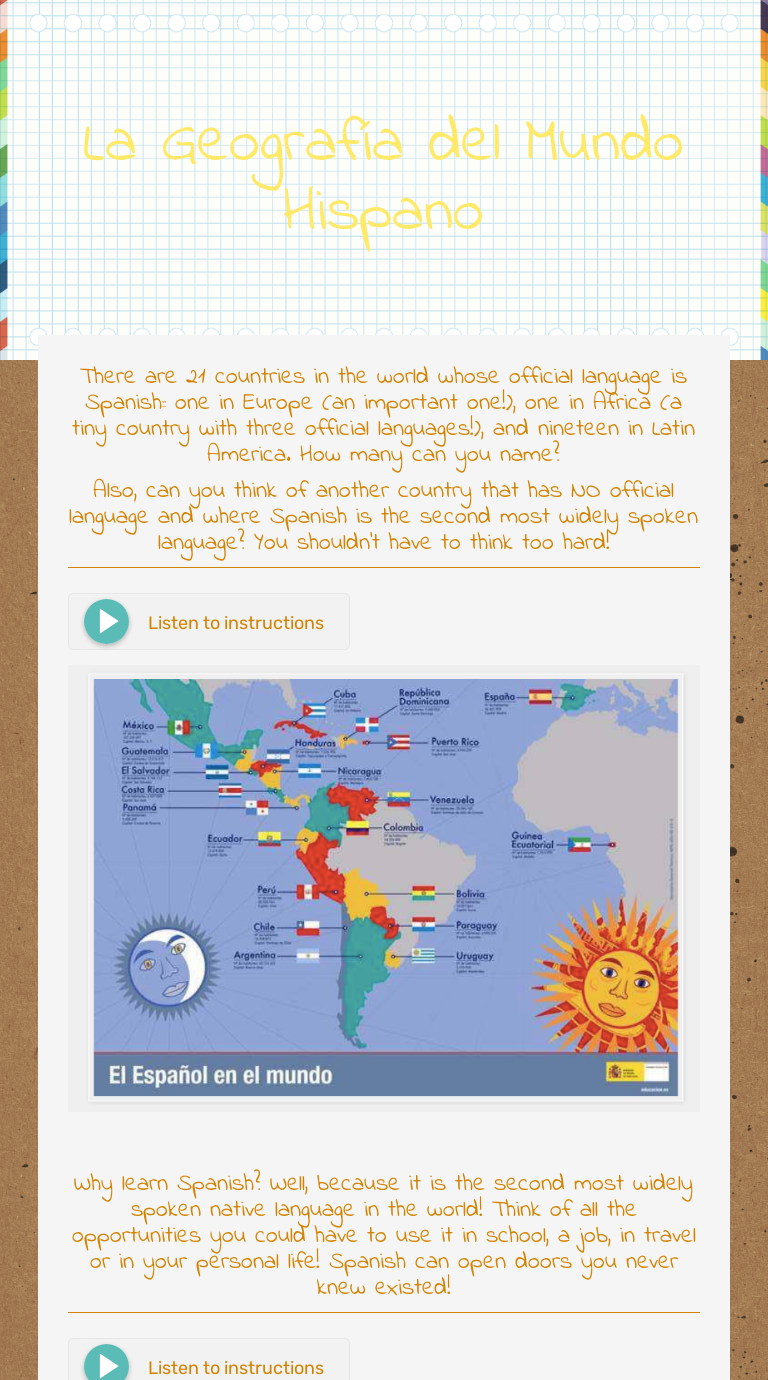 Get thousands of teacher-crafted activities that sync up with the school year. Can you identify these Spanish-speaking countries from the clues provided. La Geografía del mundo hispano Las Celebraciones en el mundo hispano Los Deportes El Entretenamiento.