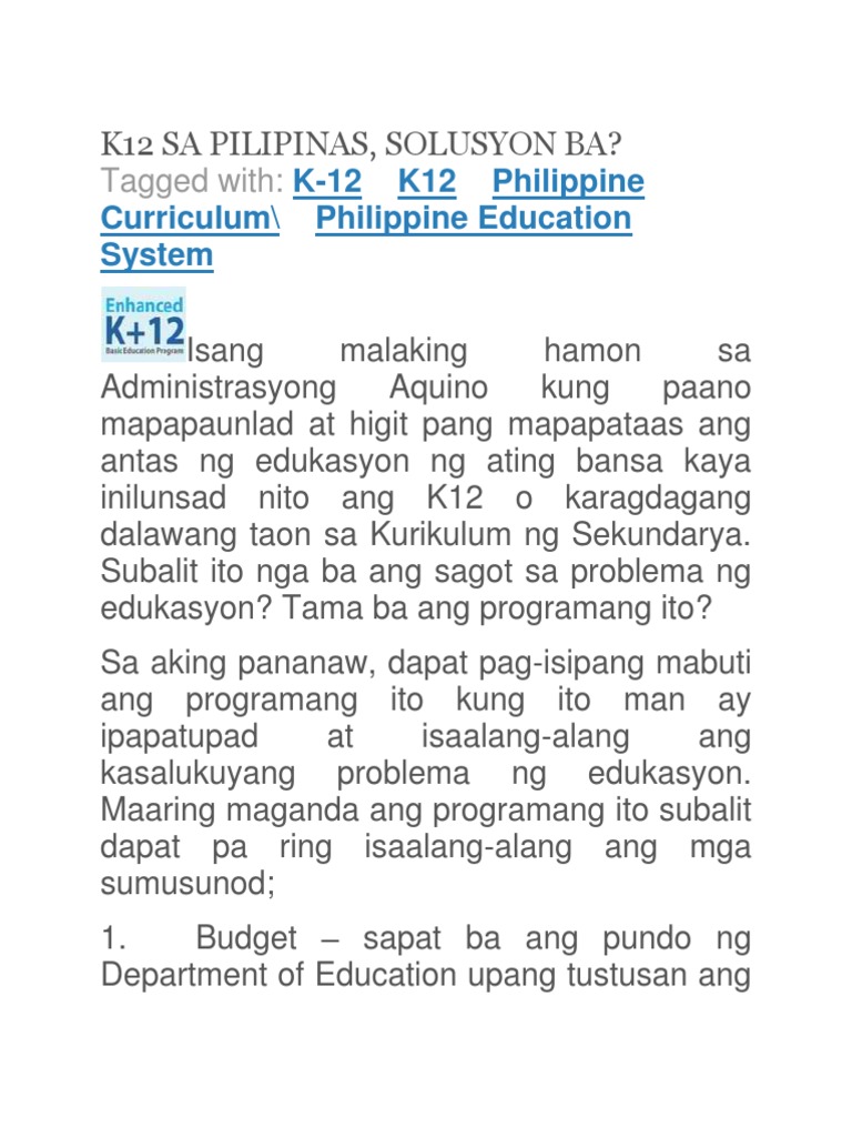 Noong taong iyon 2012 maraming nagsasabi na nagkulang ang. Ito ang programang ipatutupad ng pamahalaa at ng kagawaran ng edukasyon na naglalayong tulungan ang ating mga kabataan at ang pantayan ang sistema ng edukasyon hindi lamang sa buong Asya kung hindi sa buong mundo. Sa programang ito nagkaroon din ng junior highschool grade 7-10 at senior highschool grade 11-12.