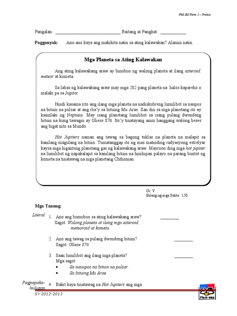 Gr 5 Mga Planeta Sa Ating Kalawakan Oral Pretest Pdf